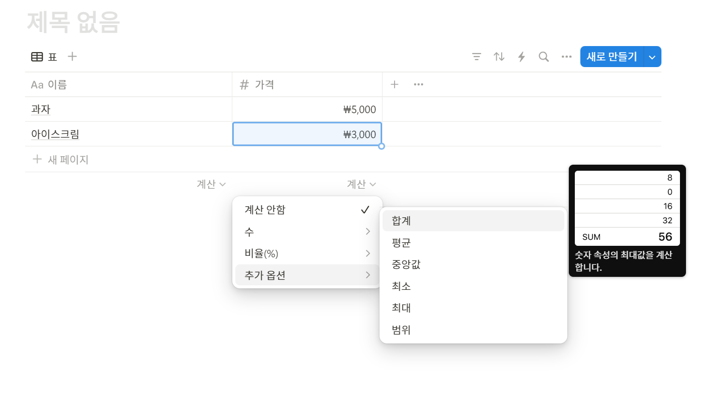 엑셀은 함수를 입력해야하지만 노션은 클릭 몇 번으로 가격이나 숫자 합계를 구할 수 있거든요